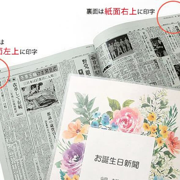 お誕生日新聞の新聞上部(余白部分)に、コメントを自由に15文字まで印字することができます。「二十歳の新聞」「結婚した日の新聞」など...。新聞余白にコメントを添えることで、「何の日」の新聞なのかが一目で分かりやすくなります。